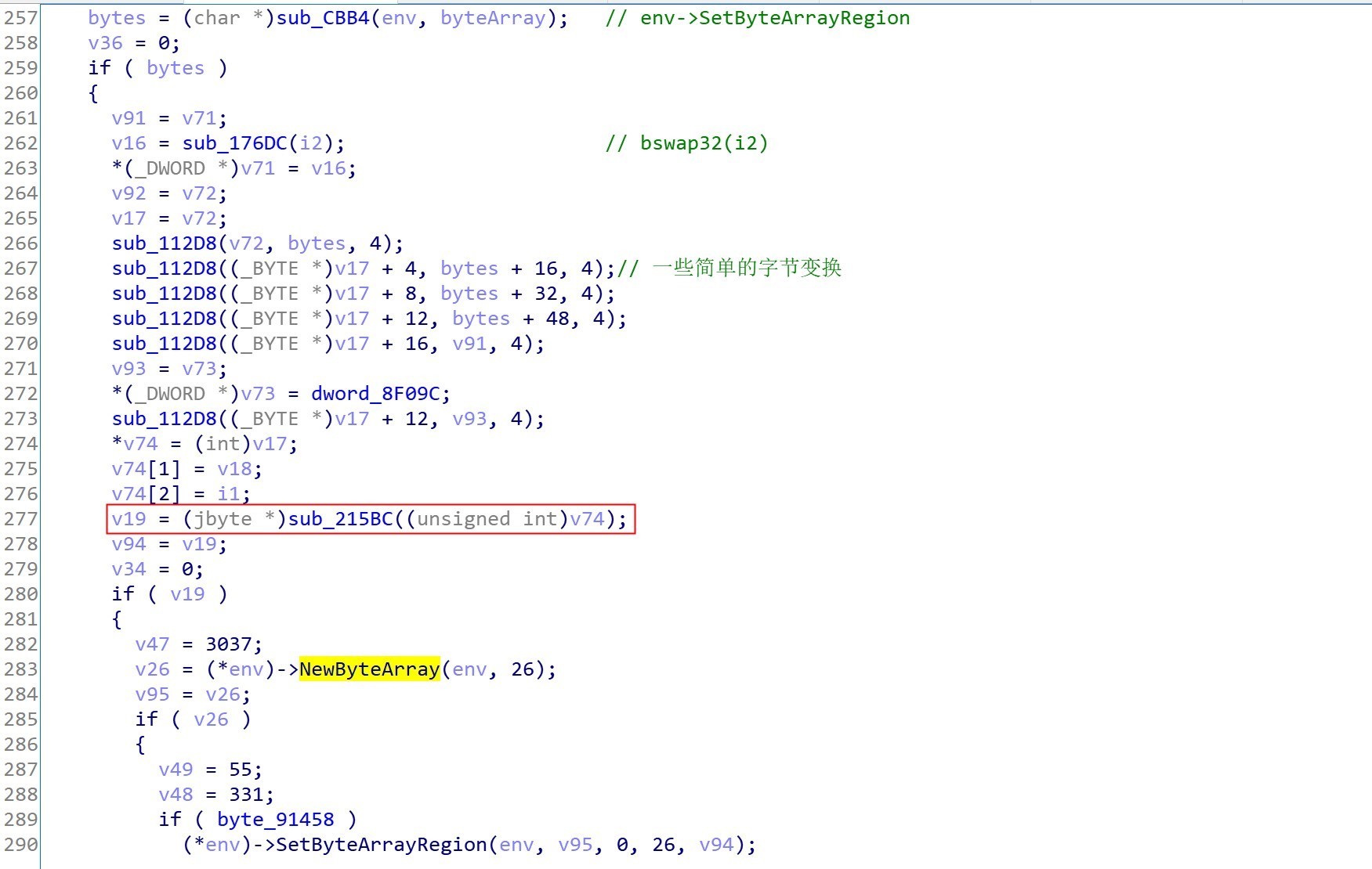 可以看到在上图处取出了jni方法的参数,紧接着,对java层传入的数组和参数i2进行了一些简单的字节变换操作,将变换后的的数组,数组大小以及i1的值作为一个新的结构传入到sub_215BC。从后面调用的jni函数来看,sub_215BC的返回值极可能是最终加密之后的byte数组,所以我们继续跟进去: