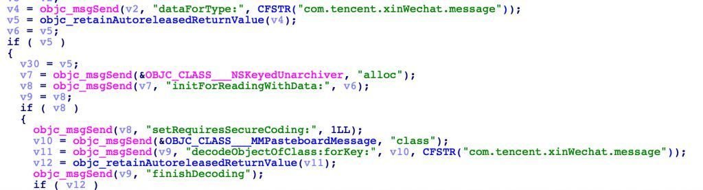 如下面截图所示,Mac 版本的微信在反序列化粘贴板对象的过程中,并没有使用secure coding 以及白名单等设置,导致任何可以响应 [initwithcoder:] 函数的 objective-c 对象都能被创建并使用,会引起很大的攻击面。