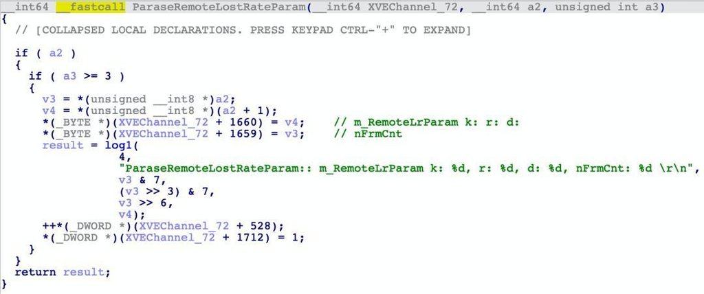 ParaseRemoteLostRateParam 函数中,根据远端的 pData 中数据设置了XVEChannel+72 处对象的内部数据。通过参数 a2,在 pData 中读取两个字节,并最终设置到 m_RemoteLrParam 和 nFrmCnt 两个成员变量中。