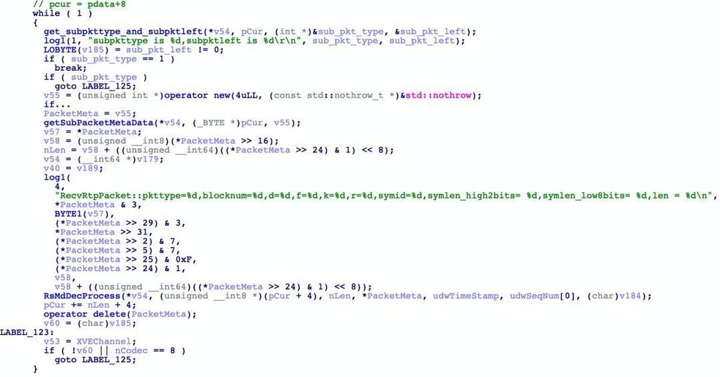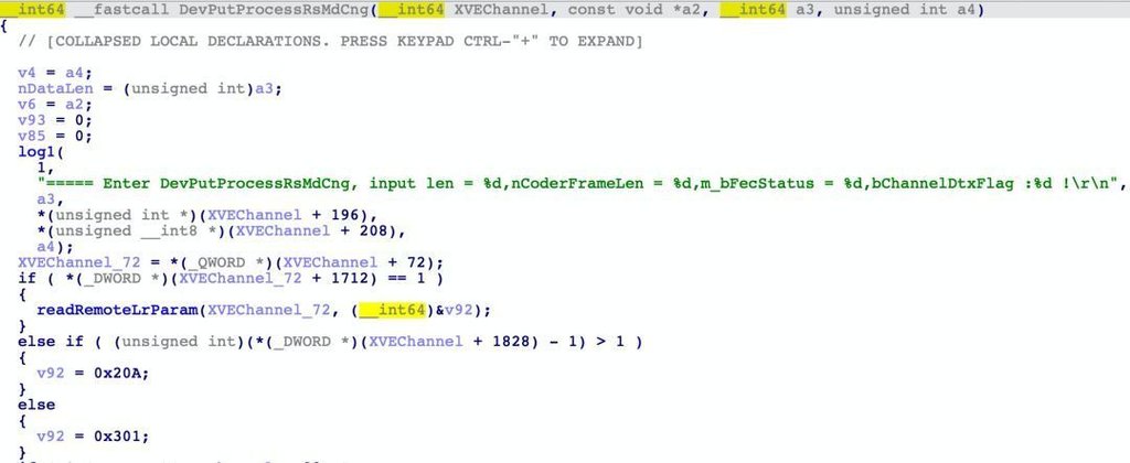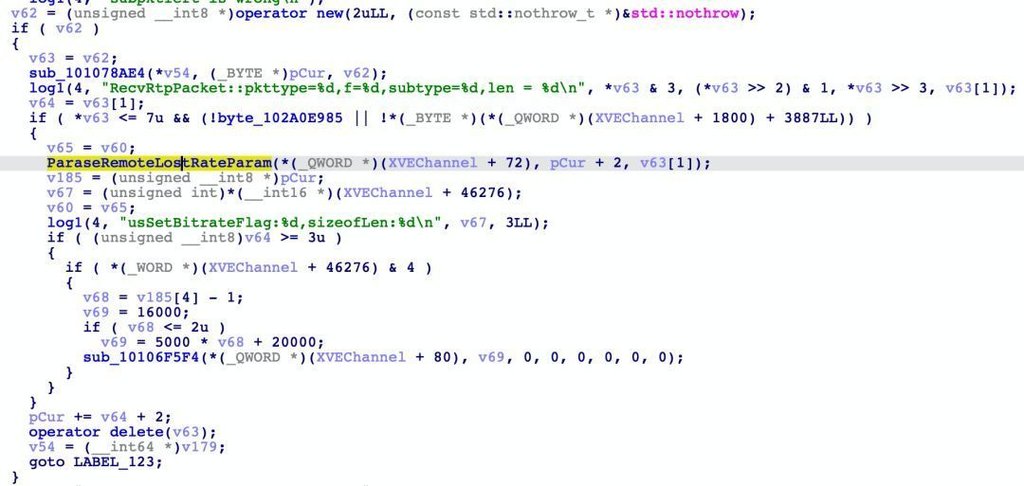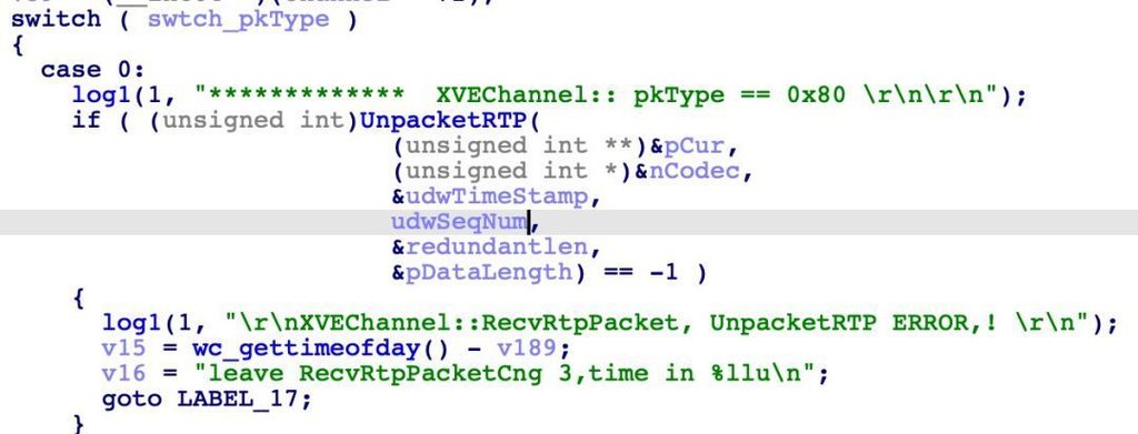 在收到远端的网络数据后,RTP 数据包将被 RecvRtpPacketCng(__int64 XVEChannel, unsigned int *pData, __int16 len, void *a4) 函数处理,这里的参数 pData内容是语音通话的远端完全可控的。该函数会根据网络包中指定的过不同的代码解析