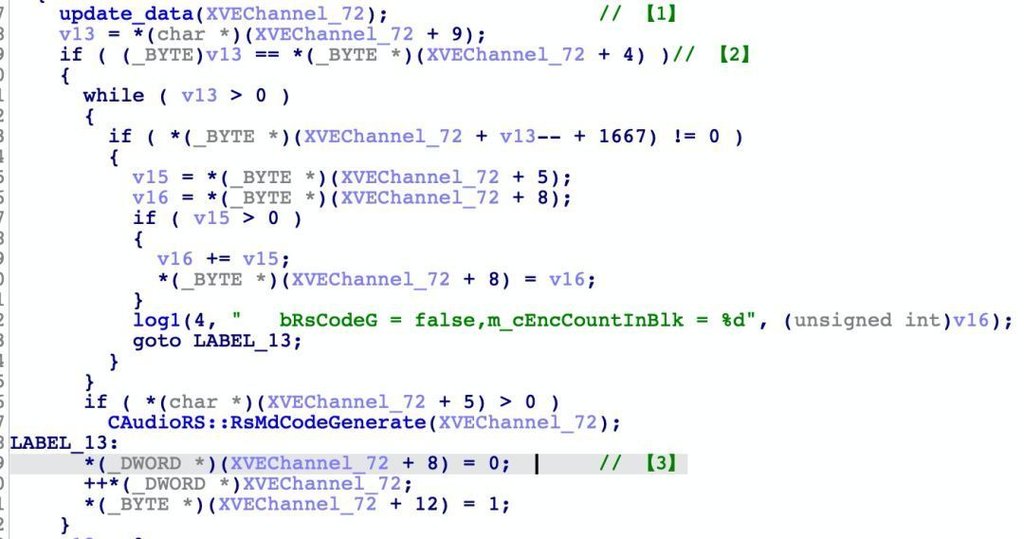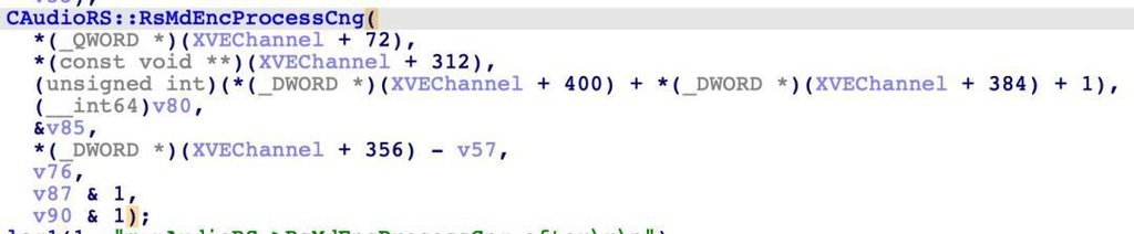 当 CAudioRS::RsMdEncProcessCng 刚开始执行时会通过 XVEChannel_72+9 作为 index 写一个 byte.