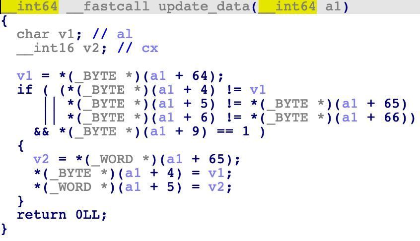 因为 XVEChannel_72 + 9 可以根据 pData 中的数据设置成攻击者可控的数据,当 XVEChannel_72 + 9 被设置为大于 XVEChannel_72 + 4 时,就必须一直自增且产生整数溢出后重新与 XVEChannel_72 + 4 相等时, 才能将 XVEChannel_72 + 9清零。
