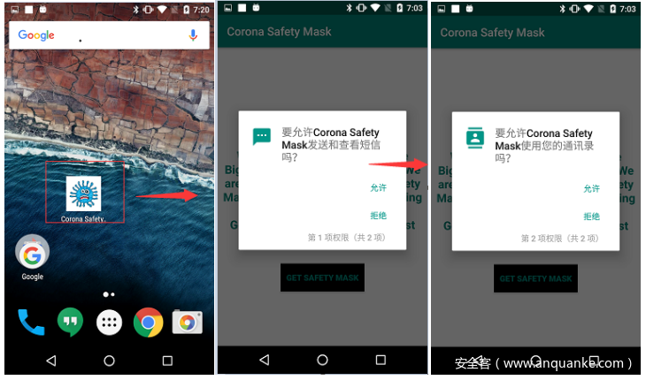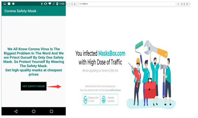 威胁行为者在域名为coro****etymask.tk的网站上分发一个文件名为CoronaSafetyMask.apk的恶意程序,他们谎称使用该应用能让用户购买到安全防护口罩。由于冠状病毒感染的人数持续上升,防护口罩供不应求。人们迫切需要储备大量防护口罩来保障出行的安全,威胁行为者利用人们对防护口罩的需求诱导用户安装恶意程序。
