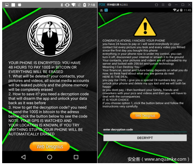 勒索者恐吓用户如果不在24小时内支付250美元的比特币(勒索页面已经更新,之前是在48小时支付100美元比特币,但代码并未更新),将会将用户手机上的联系人、图片、视频、社交账户等信息曝光于众并谎称已将用户所有的联系人、图片、视频隐私信息上传到了服务器。代码中并未发现此行为。