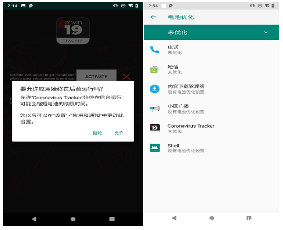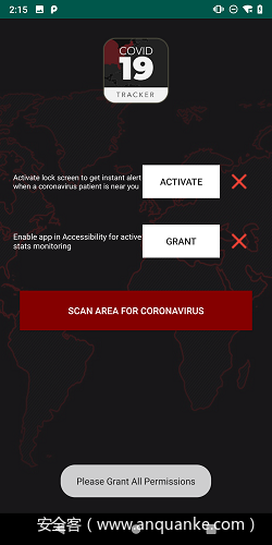 接着应用会请求激活设备管理器并开启无障碍服务。否则用户无法使用应用的冠状病毒地域扫描功能。当用户授予了应用请求的所有权限并点击扫描功能。应用返回到主界面并隐藏图标,可见该应用并没有跟踪和统计冠状病毒肺炎患者信息的功能。