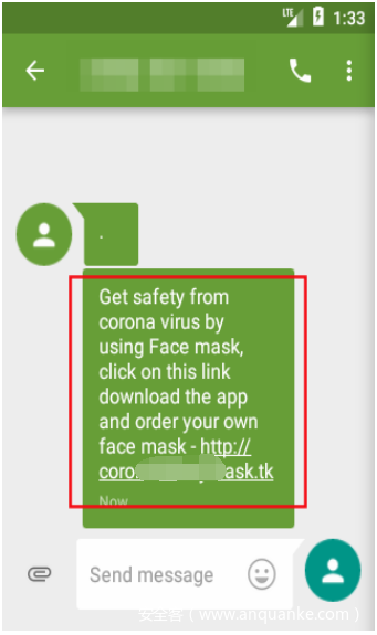 短信内容:“通过使用口罩保障自身安全性,单击此链接可下载该应用并订购自己的口罩-http://coro***fetymask.tk ”。