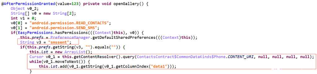 该应用程序检查它是否已经发送了SMS消息。如果没有,它将收集所有受害者的联系人,如下面的屏幕截图所示: