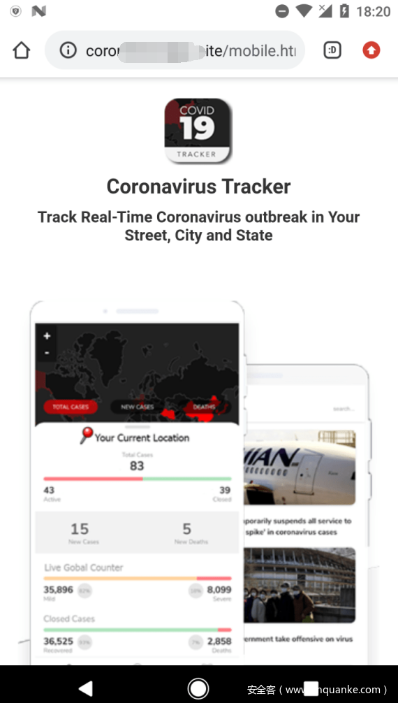 威胁行为者在域名为coro***rusapp.site的网站上分发一个文件名为CoronavirusTracker.apk的恶意程序。他们谎称该应用能为用户提供有关COVID-19的跟踪和统计信息,包括热图图像。用户通过此应用能够清楚的知道自己所在位置附近的新型冠状病毒肺炎感染者。
