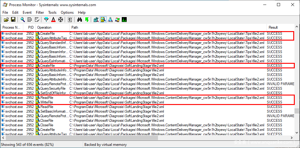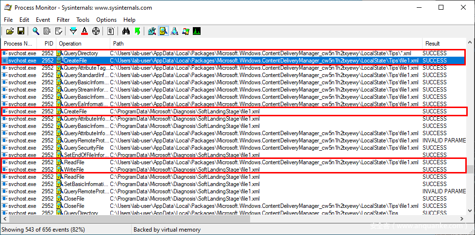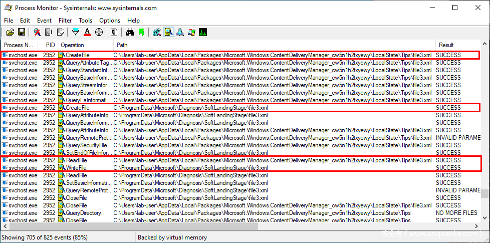 这一次QueryDirectory操作能成功完成,目标服务会读取file1.xml的内容(该文件为目录中第一个XML文件),将其拷贝到C:\ProgramData\Microsoft\Diagnosis\SoftLandingStage\目录中的一个新文件(文件名保持一致)。