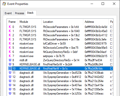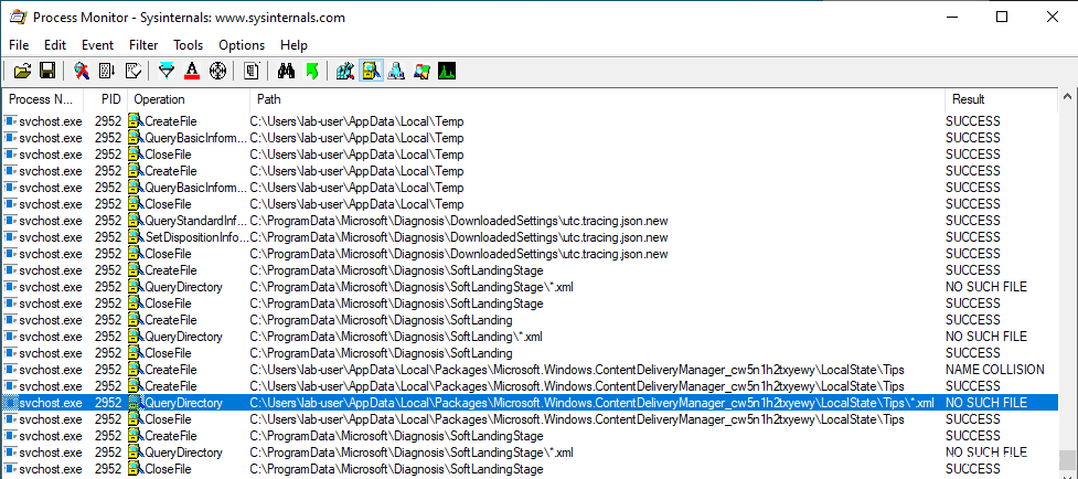 我在测试环境中使用的用户为lab-user,该用户为具备标准权限的正常用户,不具备任何管理员权限。我们之所以能观察该操作,是因为目标服务调用了diagtrack.dll中FindFirstFileW():