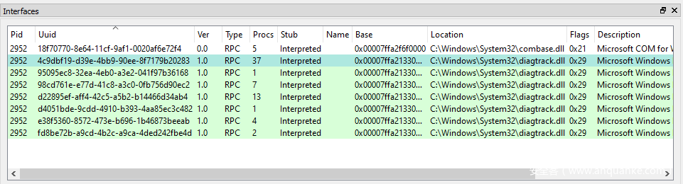 这里我们将重点从COM转到RPC(Remote Procedure Call,远程过程调用)上,我们可以使用RpcView查看Diagtrack提供的接口。