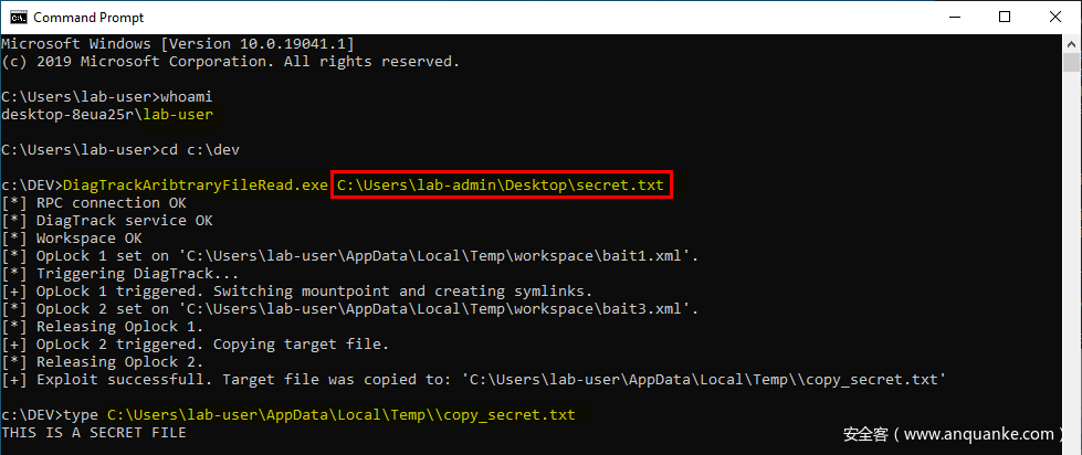 这种方式较为可靠,使普通用户能够获得NT AUTHORITY\SYSTEM能读取的任意文件的副本。我开发的PoC测试结果如下图所示: