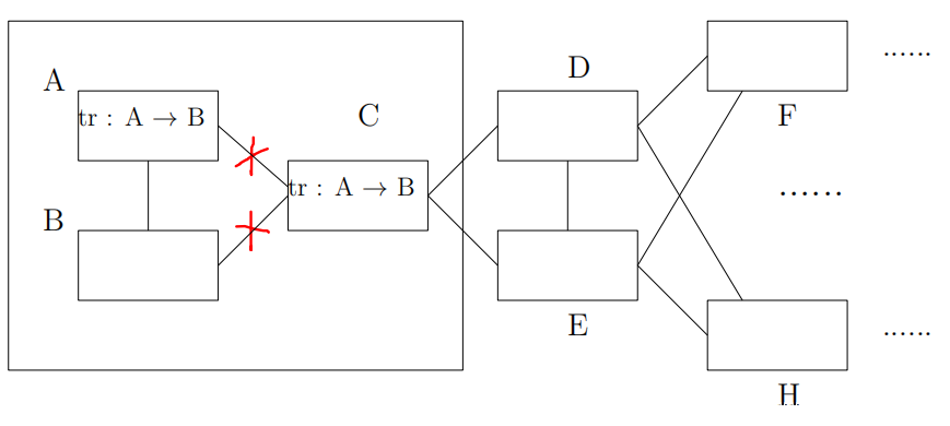 在本节中,非形式化地介绍三角攻击的发生方式。考虑这种情况,其中只有一个“network gate”可以将交易分散到外部,如图1所示。A,B,C,D,E,F和H是区块链上的节点。下图描绘了网络拓扑结构,该结构用于通过路由实现广播功能。