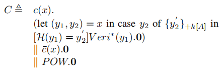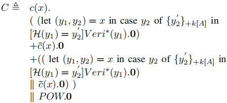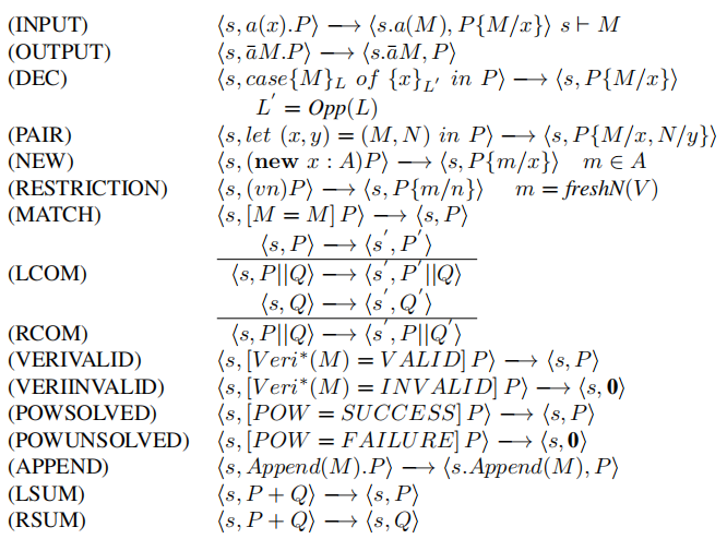 整个交易过程按流程形式化如下。请注意,这里说的是用于矿工彼此通信的通道是专用的,但是稍后在分析区块链协议的安全性属性时,将忽略通道名称之间的差异,即所有通道都被视为与通道之间交互的方式。环境。