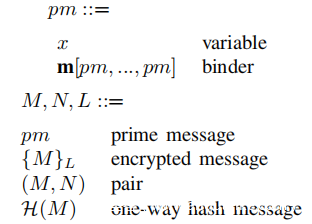 定义1(消息): 表示三个不相交的可数集,V代表变量,B代表binder名称,L代表标签。令变量为x,y,z…;binder名称为m,n,k…,以及标签的范围a,b,c …