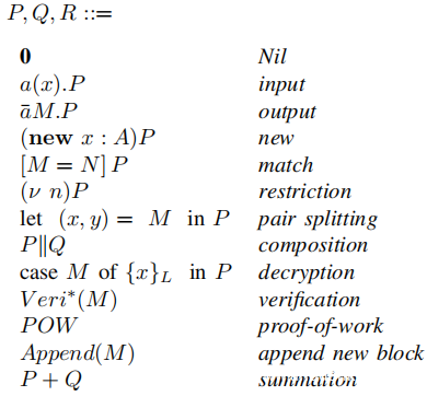 为简单起见,在本文中,仅在有界会话上处理区块链协议,即以下提到的所有事物都被视为有限事物。采用模型检查方法来检测区块链的潜在攻击,即对于给定的安全属性,如果未检测到漏洞,则相关的区块链协议必须对该属性安全。
