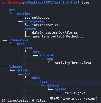 比如这位大佬在源码还没有开源的情况下,仅通过逆向分析system.img镜像和libart.so就还原出源码并应用到安卓9上去,是真的大佬,原贴链接:FART:ART环境下基于主动调用的自动化脱壳方案 [android脱壳源码公开,基于android-9.0.0_r36] 。当然以下的分析其实这位大佬和寒冰大佬已经讲得披露得非常清楚了,也没啥新的东西,只是再康康源码,见下图源码结构。