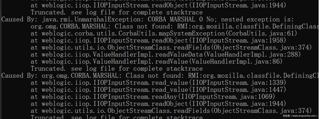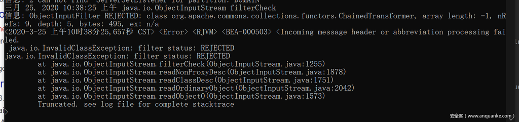 - T3协议中,如果待反序列化中的任意一个类在黑名单列表,反序列化都会终止,并抛出异常