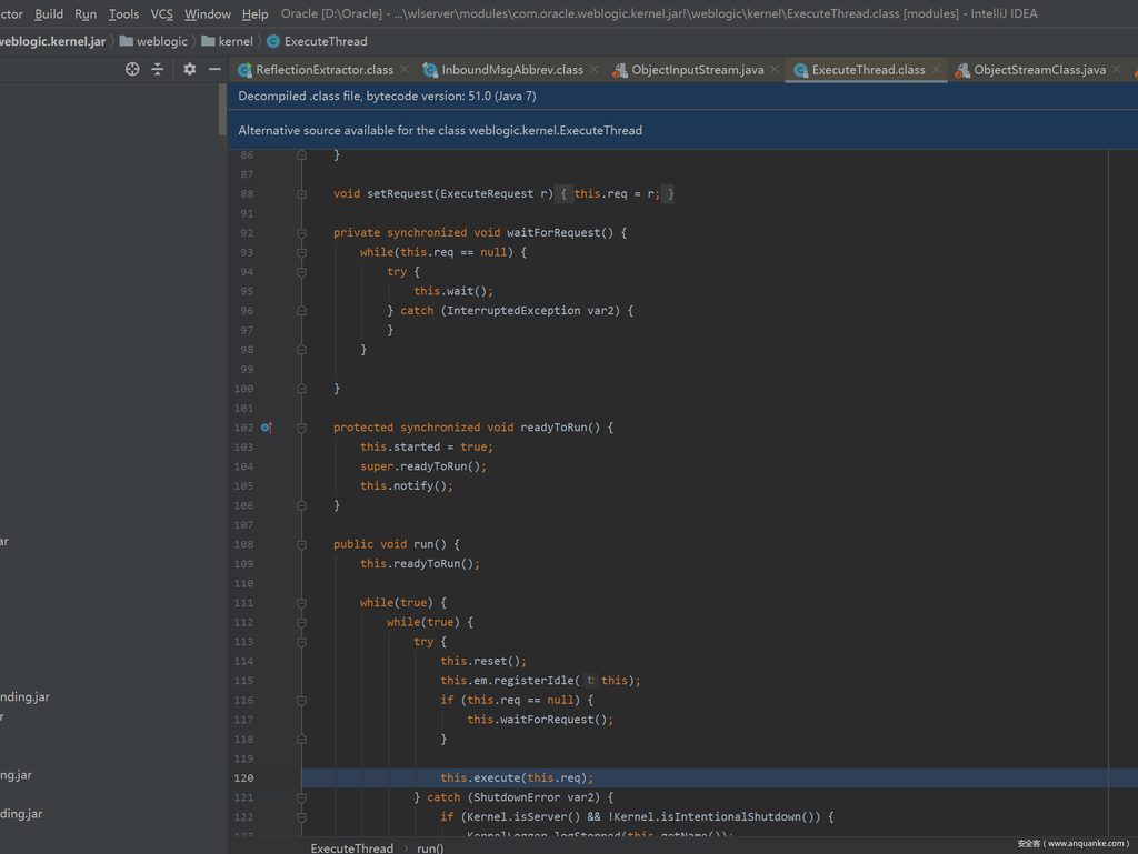weblogic首先在moudle/com.oracle.weblogic.kernel.jar中 的ExexuteThread.class的run函数中监听7001的连接,并调用execute方法去处理请求,也就是req,如图