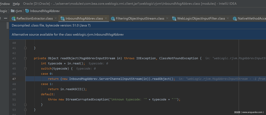 可以看出,weblogic早就通过黑名单过滤的方式,禁止该类工具的攻击。下面我们分析一下T3反序列化漏洞
