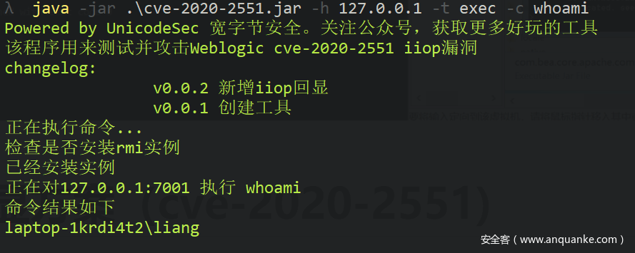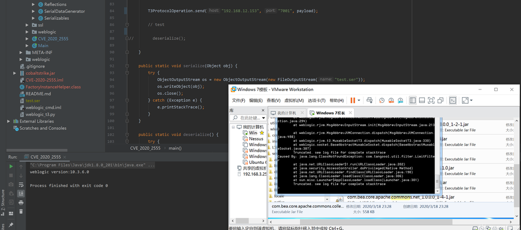 既然上面已经分析了,T3的话,我们可以使用cve-2020-2555的gadget去实现相关功能,最终触发恶意类的绑定函数,成功绑定一个实例,并可以实现执行命令,如图,
