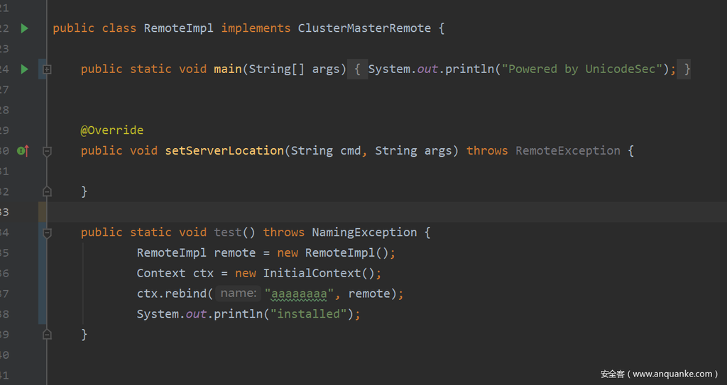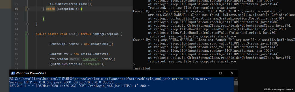这样就实现从字节码到类的转变。而我们需要发送的恶意类,主要作用是绑定一个实例,完成攻击者与weblogic的rmi交互即可。恶意类的绑定实例代码如下