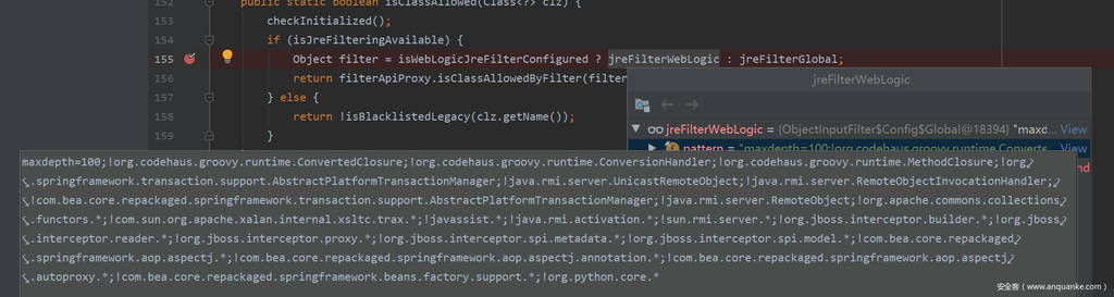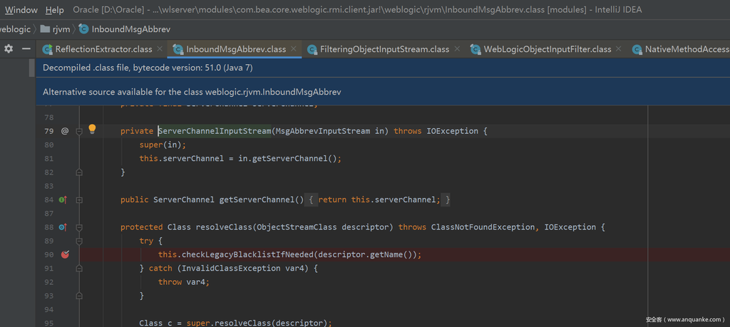 在serverChannelInputStream的resolvClass中,会对待反序列化的类检查一下是否为weblogic黑名单中的类,并防止该类反序列化。这里就是传说中的weblogic反序列化黑名单。