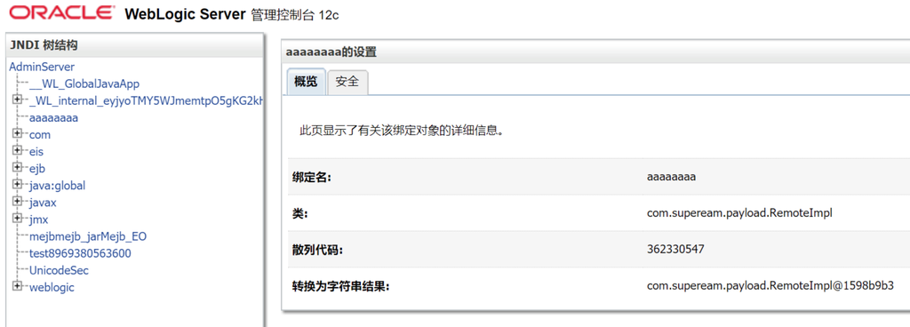 当然这个是无回显的,所以我们需要获取远程对象,检查是否已经绑定成功。所以通过如下代码检测