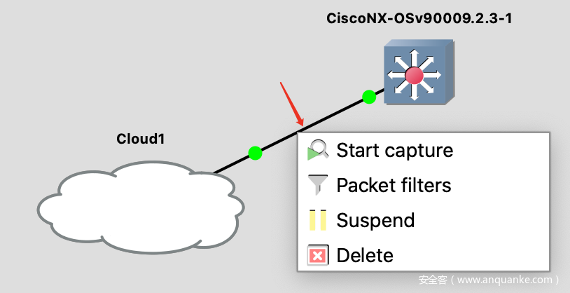 在测试的过程中,我们还可以右击这根直连线,来使用wireshark抓包。