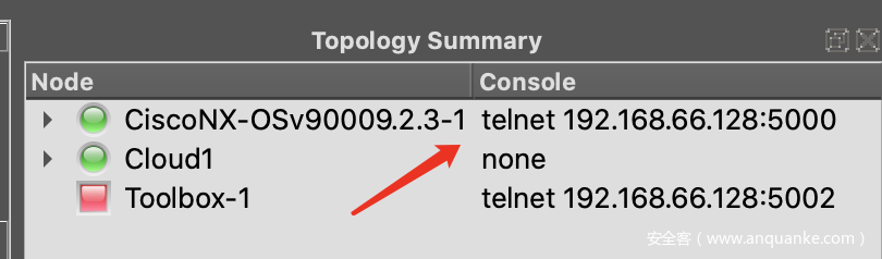 不过这个时候网络并没有连通,还需要通过串口连接到交换机进行网络配置。GNS3默认情况下会把设备的串口通过telnet转发出来,我们可以通过GNS3界面右上角看到telnet的ip/端口。
