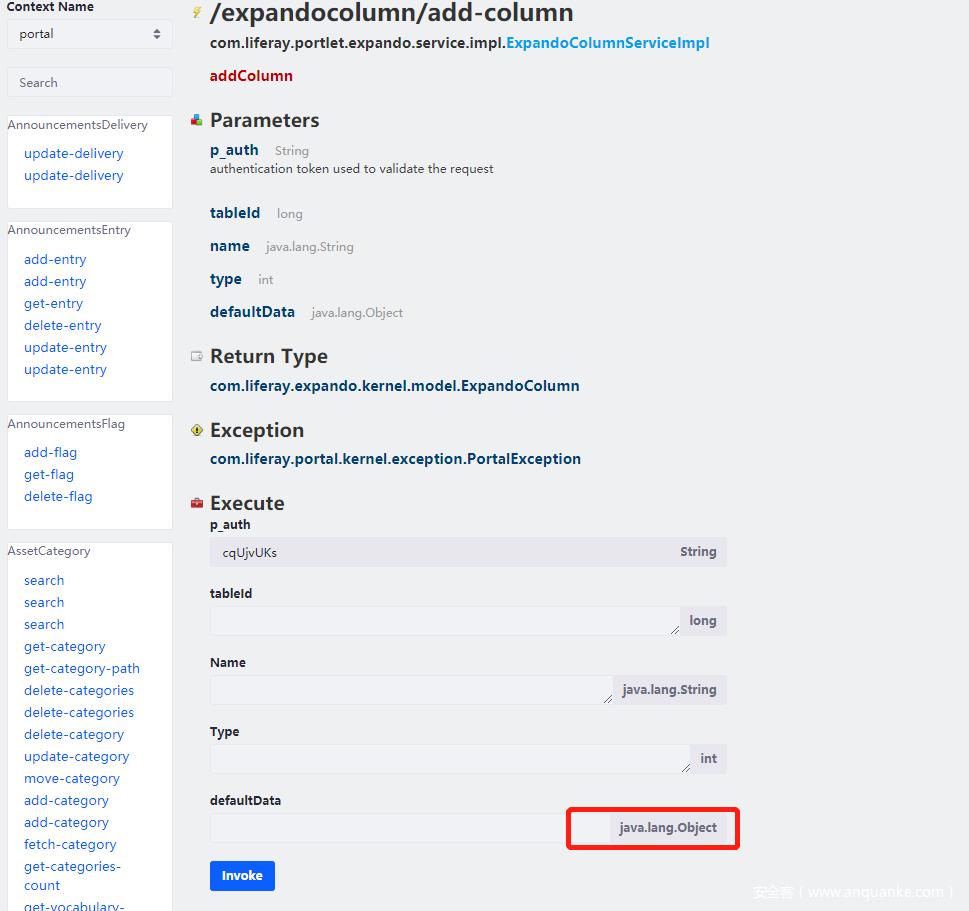 所以需要找在setter方法中或默认构造方法中存在恶意操作的类。去看下marshalsec已经提供的利用链,可以直接找Jackson、带Yaml的,看他们继承的利用链,大多数也适合这个漏洞,同时也要看在Liferay中是否存在才能用。这里用com.mchange.v2.c3p0.JndiRefForwardingDataSource这个测试,用/expandocolumn/add-column这个Service,因为他有java.lang.Object参数: