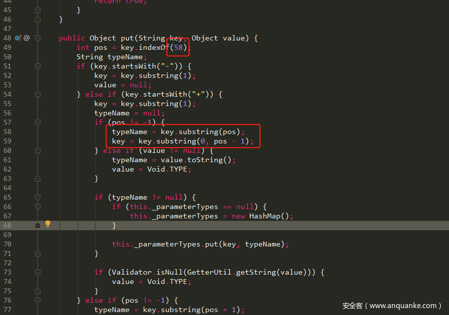 这个属性中又保存着一个JSONWebServiceActionParametersMap,在它的put方法中,当参数以+开头时,它的put方法以:分割了传递的参数,:之前是参数名,:之后是类型名。