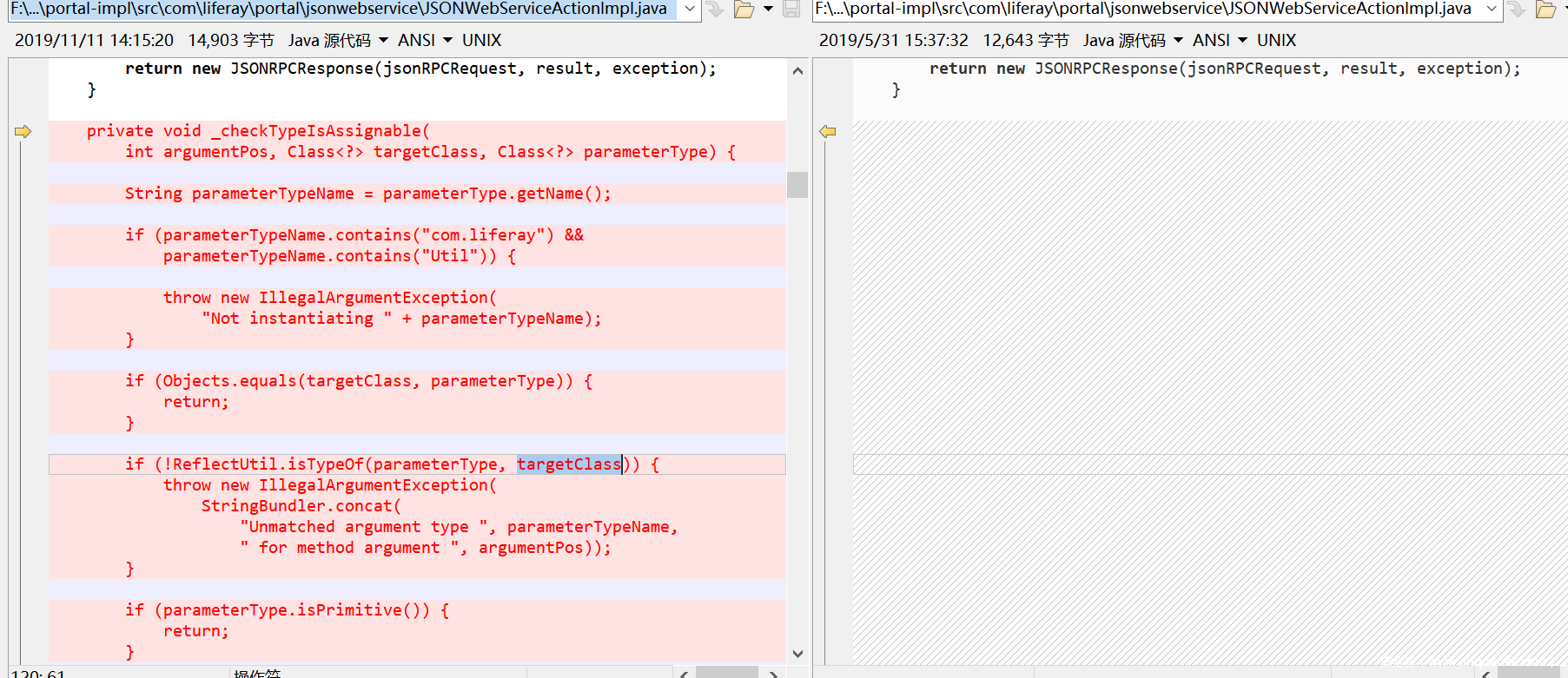 Liferay补丁增加了类型校验,在com.liferay.portal.jsonwebservice.JSONWebServiceActionImpl#_checkTypeIsAssignable中: