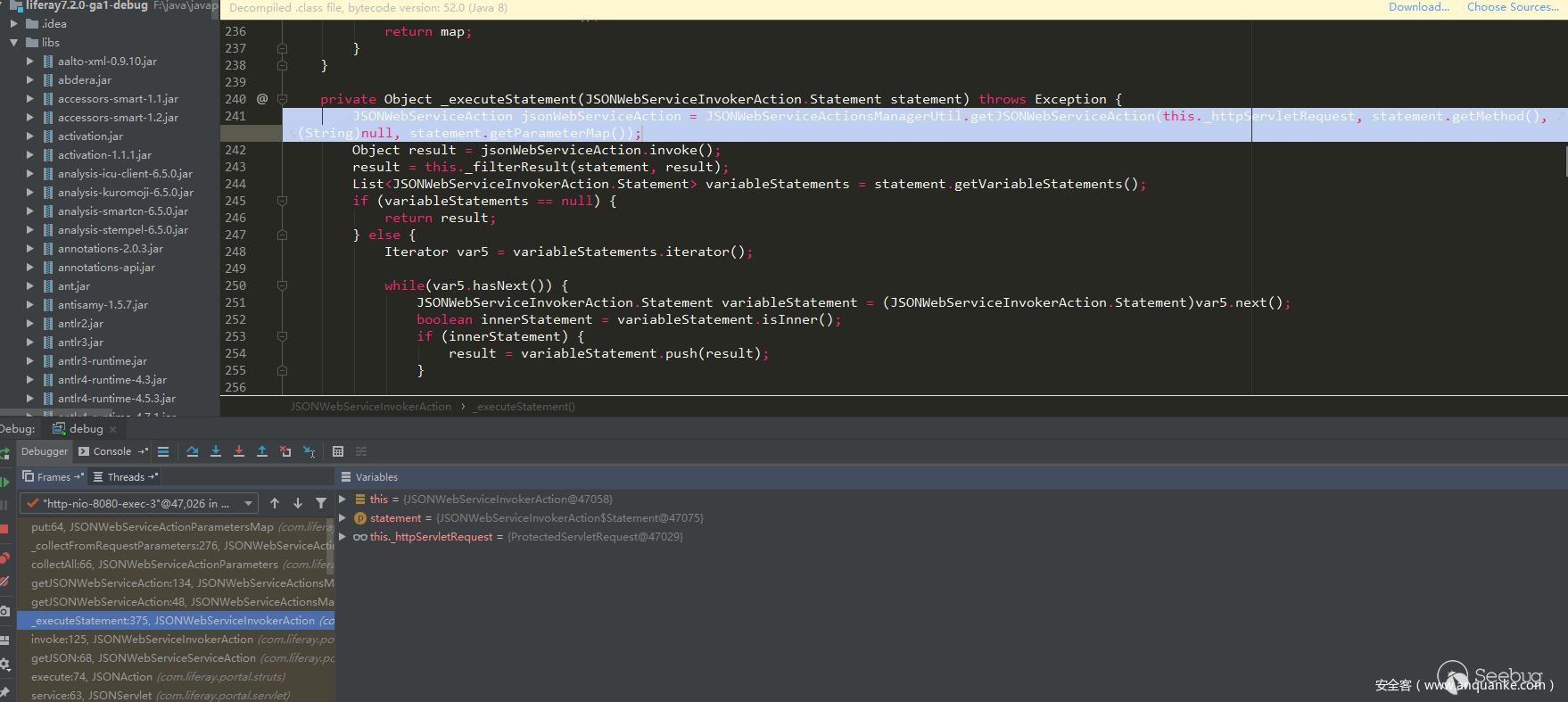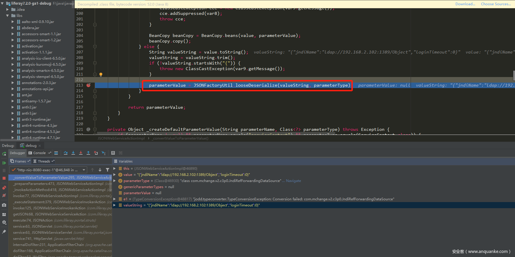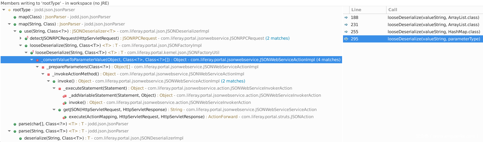 通过向上查找的方式,作者找到了可能存在能指定根类型的地方,在com.liferay.portal.jsonwebservice.JSONWebServiceActionImpl#JSONWebServiceActionImpl调用了com.liferay.portal.kernel.JSONFactoryUtil#looseDeserialize(valueString, parameterType), looseDeserialize调用的是JSONSerializerImpl,JSONSerializerImpl调用的是JODD的JsonParse.parse。
