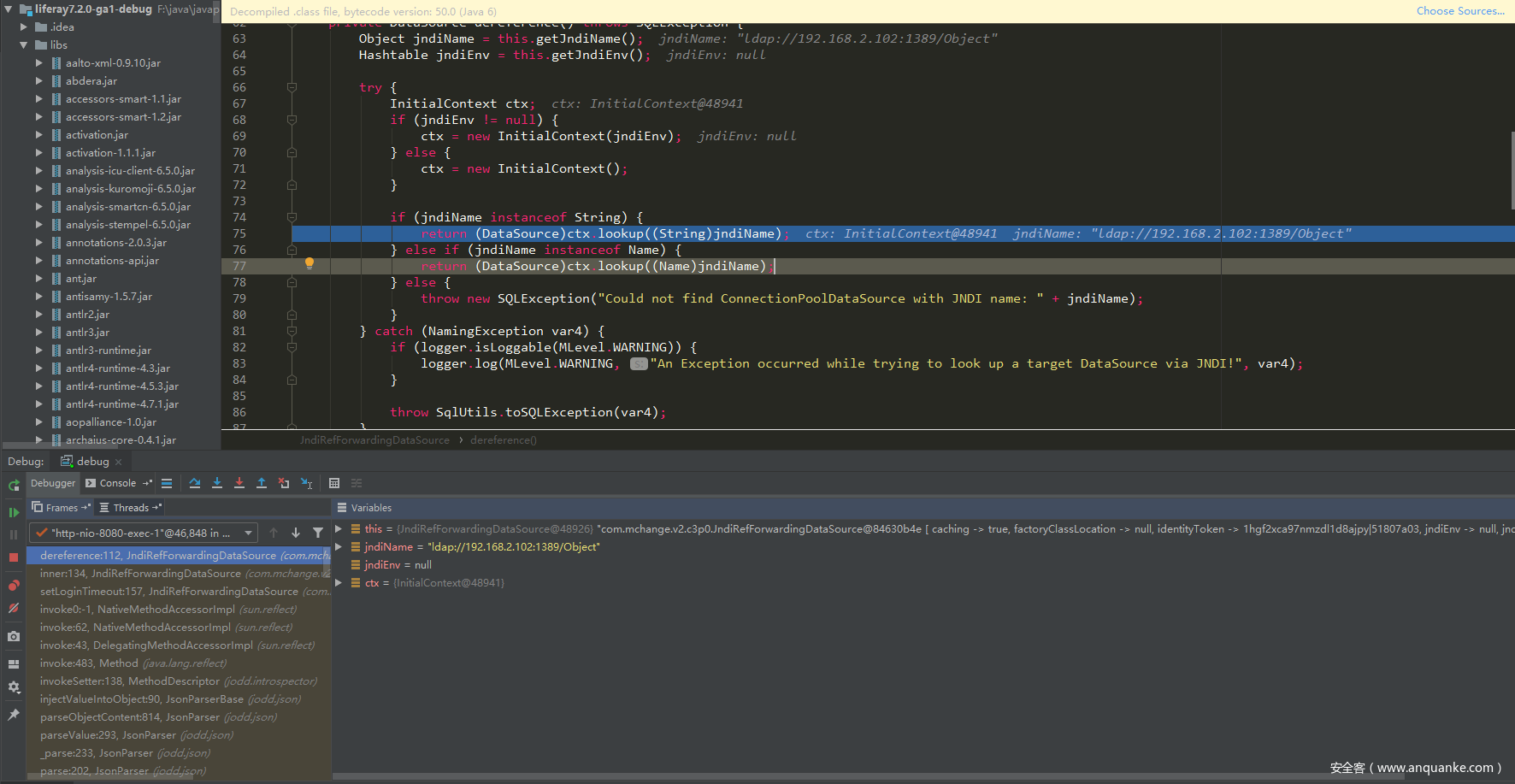 解析出了参数类型,并进行参数对象反序列化,最后到达了jndi查询: