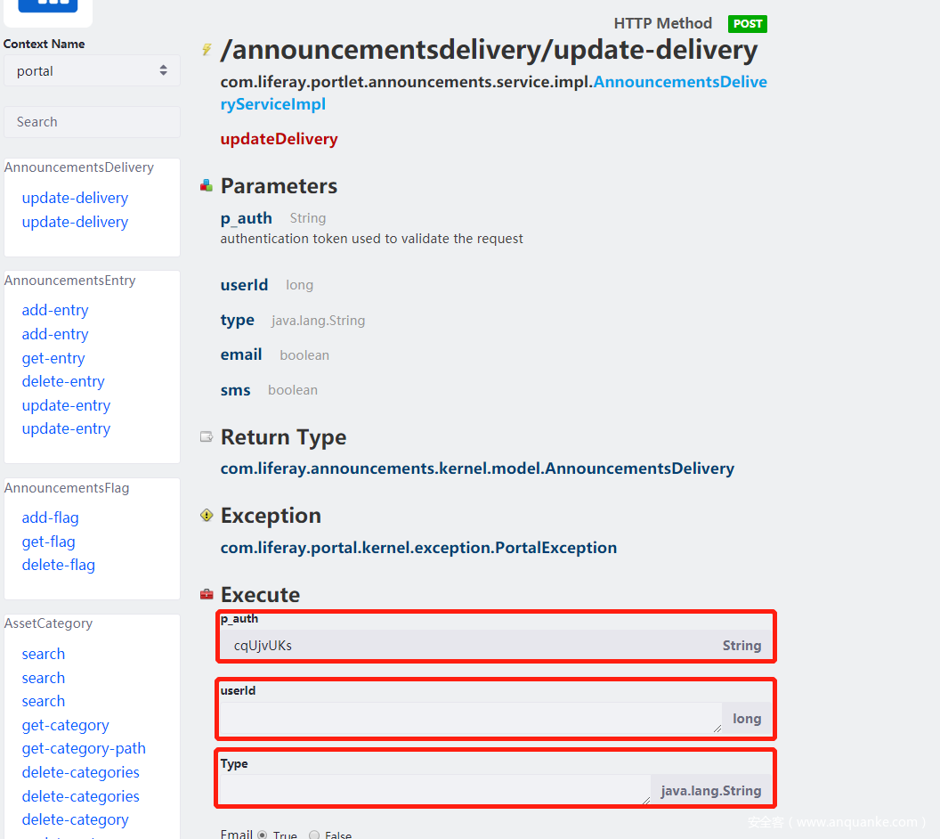 总的来说就是Liferay先查找/announcementsdelivery/update-delivery对应的方法->其他post参数参都是方法的参数->当每个参数对象类型与与目标方法参数类型一致时->恢复参数对象->利用反射调用该方法。