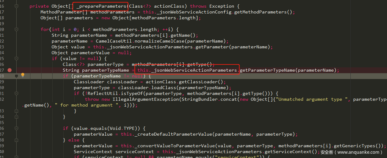 com.liferay.portal.jsonwebservice.JSONWebServiceActionImpl#JSONWebServiceActionImpl再往上的调用就是Liferay解析Web Service参数的过程了。它的上一层JSONWebServiceActionImpl#_prepareParameters(Class<?>),JSONWebServiceActionImpl类有个_jsonWebServiceActionParameters属性: