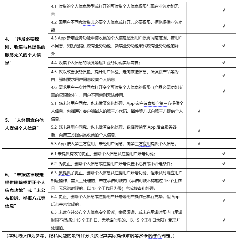 (本内容依据国家互联网信息办公室秘书局、工业和信息化部办公厅、公安部办公厅、国家市场监督管理总局办公厅、国家市场监督管理总局办 公厅联合发布的《App 违法违规收集使用个人信息行为认定方法》制定)