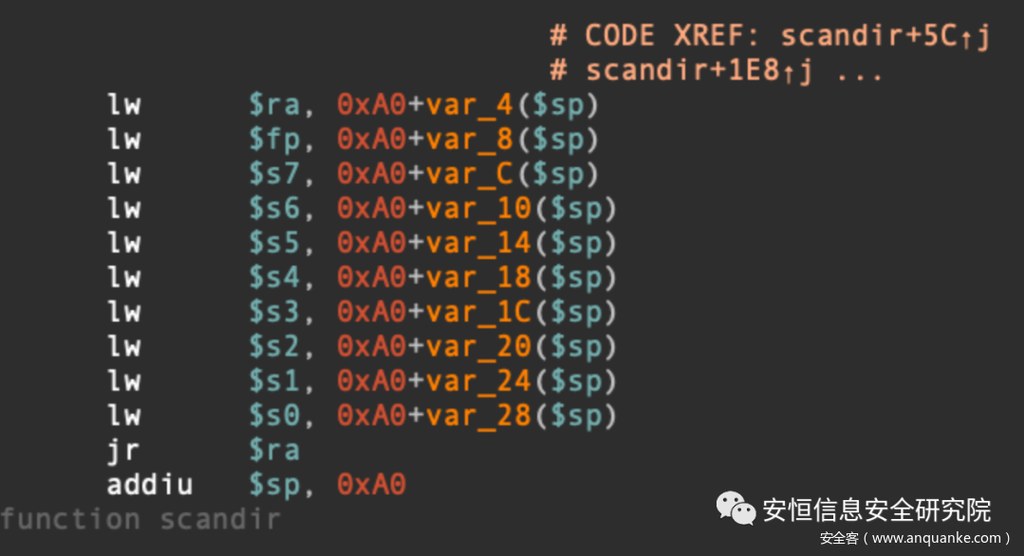 在uclibc库中,有几个比较关键的gadget,在scandir的尾部或者scandir64的尾部,从图上看基本上可以设置所有寄存器值,从s0-s7