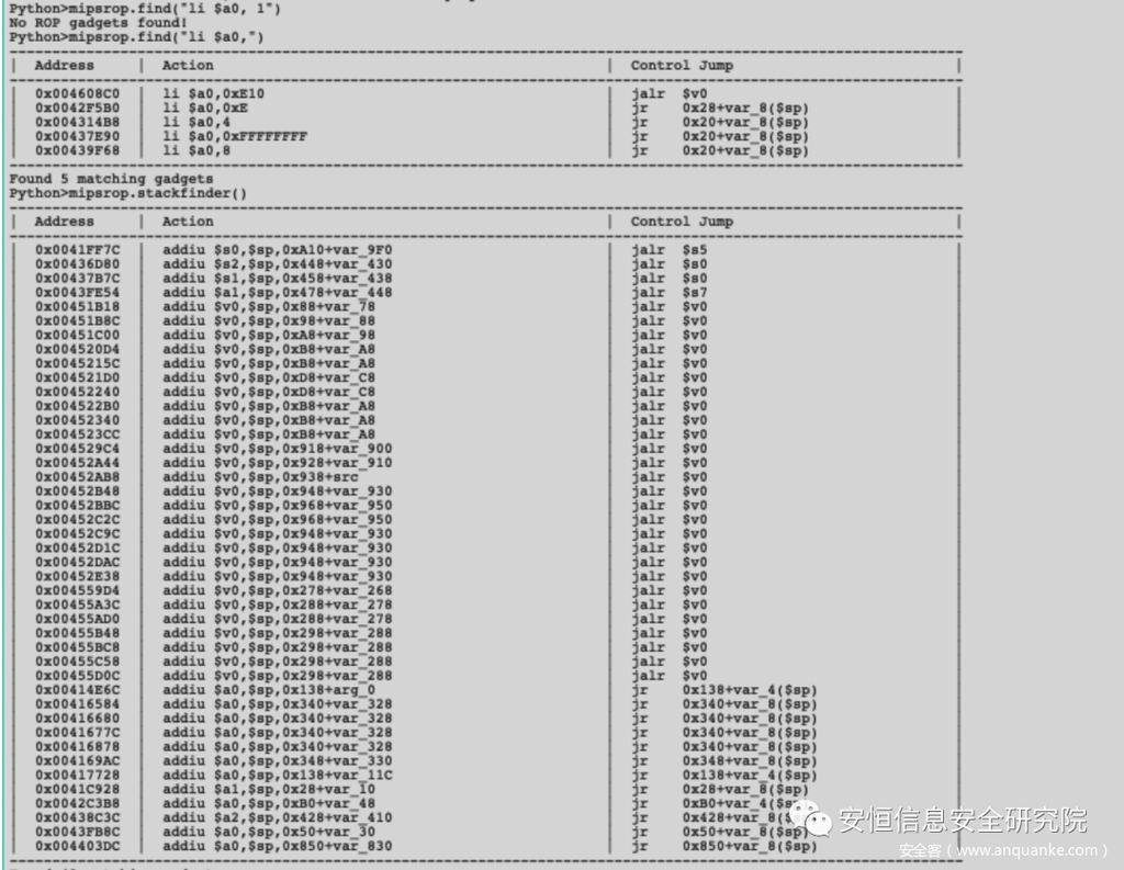 首先寻找一个设置a0为常量的Gardget,可以使用MIPSRop寻找设置a0寄存器的Gardget
