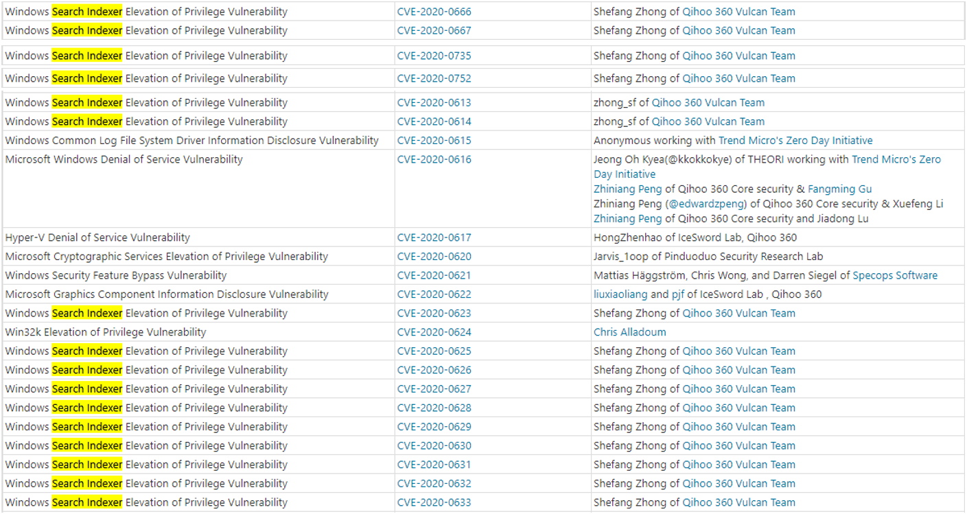 2020年1月至2月期间,微软修复了Windows Search Indexer(Windows搜索索引器)中存在的多个漏洞。