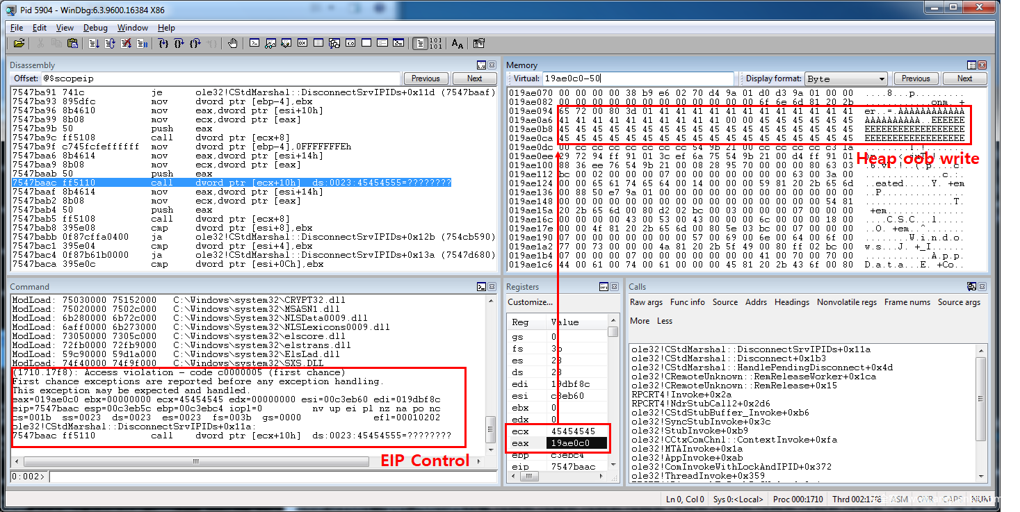 但是,我们并不能每次都看到IRpcStubBuffer分配在同一个堆上。因此,攻击者可能需要多次尝试来构造堆布局。经过几次尝试后,发现IRpcStubBuffer对象可以被以下可控值(0x45454545)覆盖。