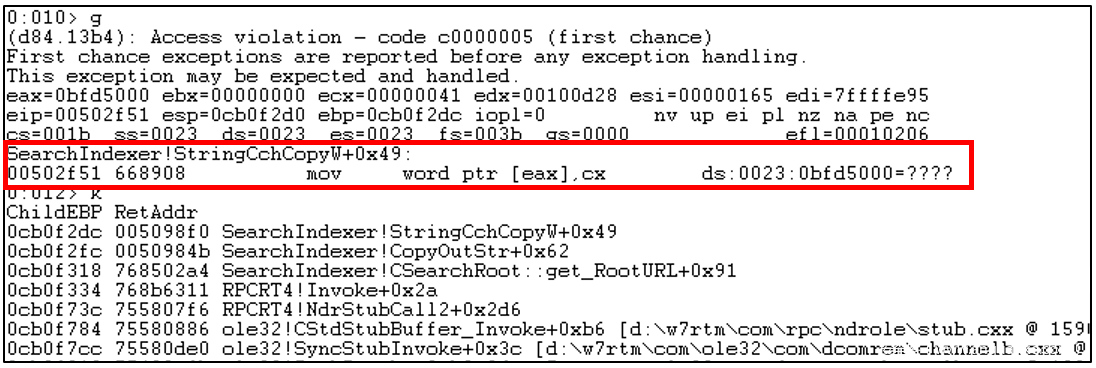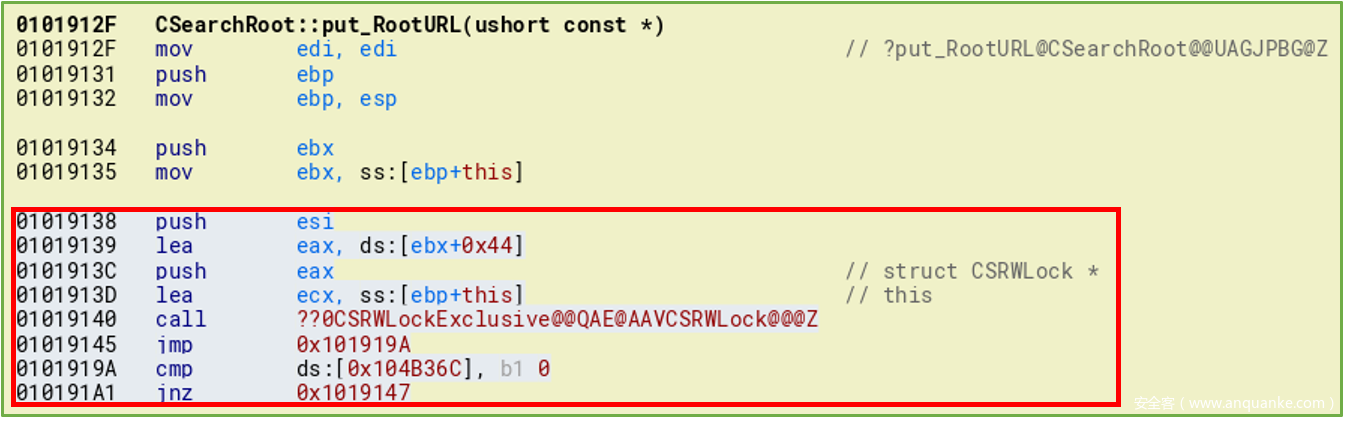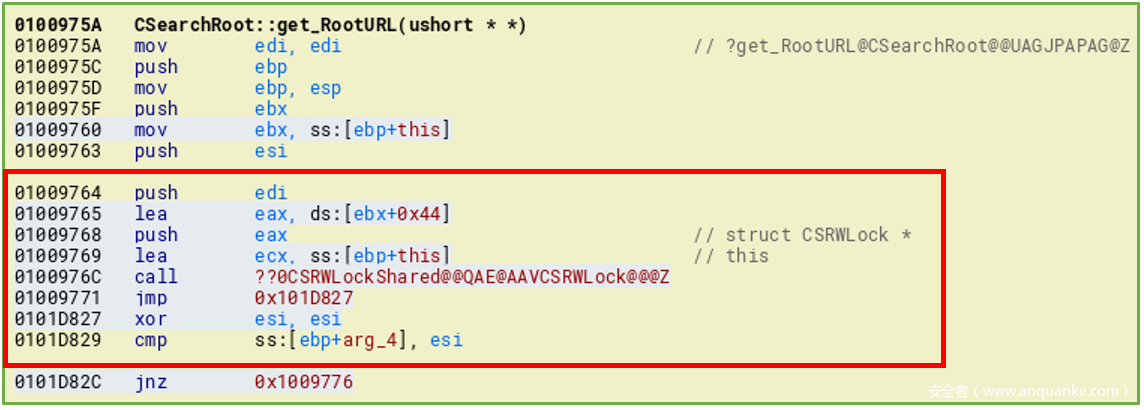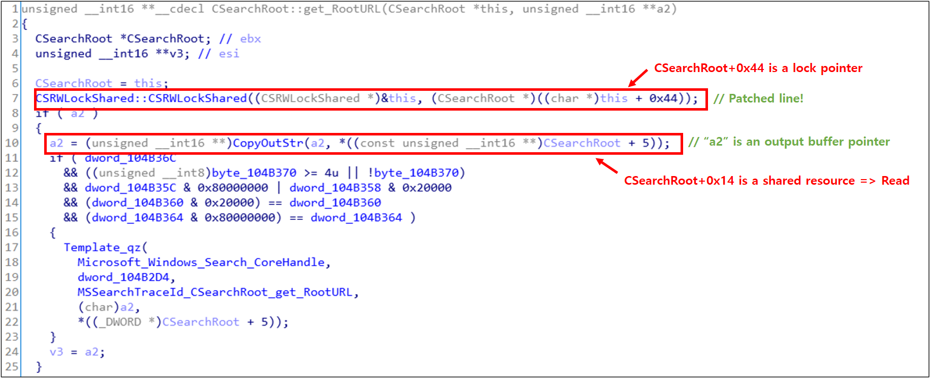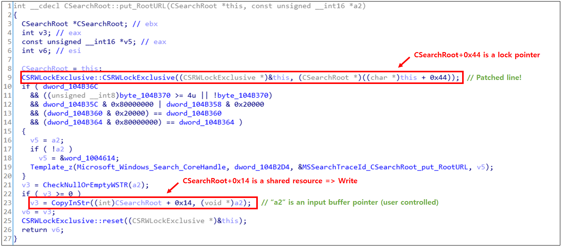 put_RootURL函数将用户控制的数据写入到CSearchRoot+0x14内存中。get_RootURL函数读取位于CSearchRoot+0x14内存中的数据。该漏洞似乎是由于与补丁有关的共享变量引起的。