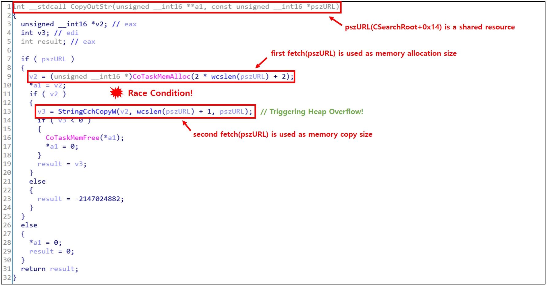 毫无疑问,在StringCchCopyW函数复制RootURL数据之前,竞争条件就已经成功,并且导致堆溢出。