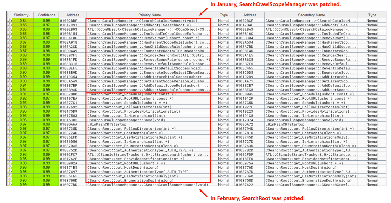 上述补丁,是通过修改CSearchCrawlScopeManager和CSearchRoot类来完成漏洞修复的。前一个类是在1月补丁中实现了修复,而后者是在2月补丁中实现修复。这两个类中,都包含相同的更改内容,因此我们仅专注于对CSearchRoot类的分析。