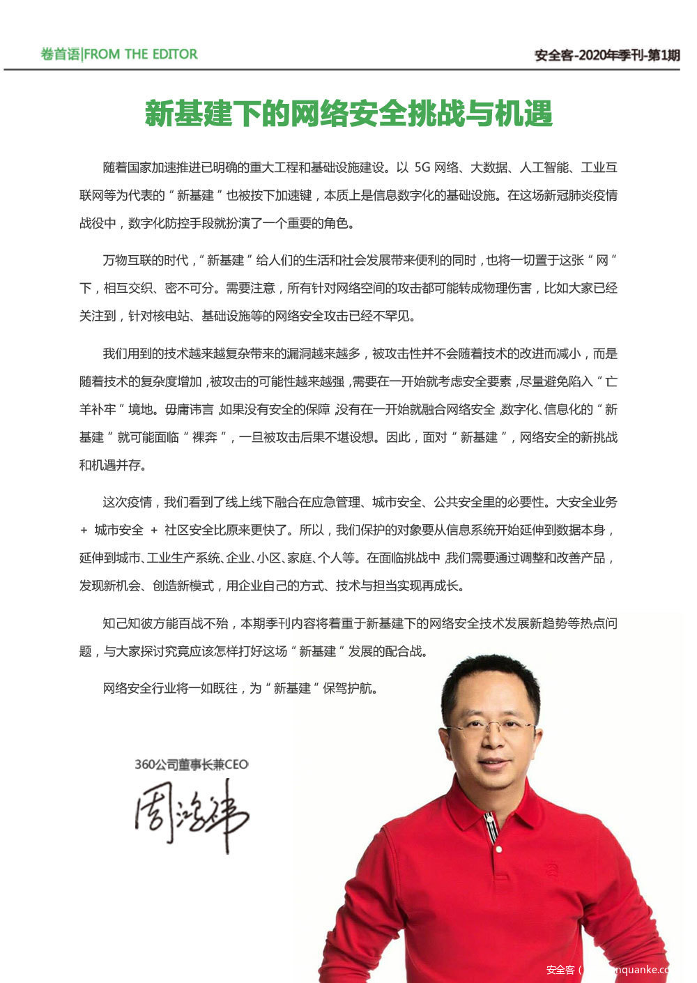 随着国家加速推进已明确的重大工程和基础设施建设。以5G 网络、大数据、人工智能、工业互联网等为代表的“新基建”也被按下加速键。这次疫情,我们看到了线上线下融合在应急管理、城市安全、公共安全里的必要性。大安全业务+城市安全+社区安全比原来更快了。所以,不能再固守过去的网络安全,我们保护的对象要从信息系统开始延伸到数据本身,延伸到生产系统,延伸到每一位用户。要及时调整和改善产品,发现新机会、创造新模式,用企业自己的方式、技术与担当作出贡献。本次季刊的主题即是以新基建下的网络安全挑战为主题,与大家一起共同探讨究竟应该怎样打好这场“新基建”发展的配合战。