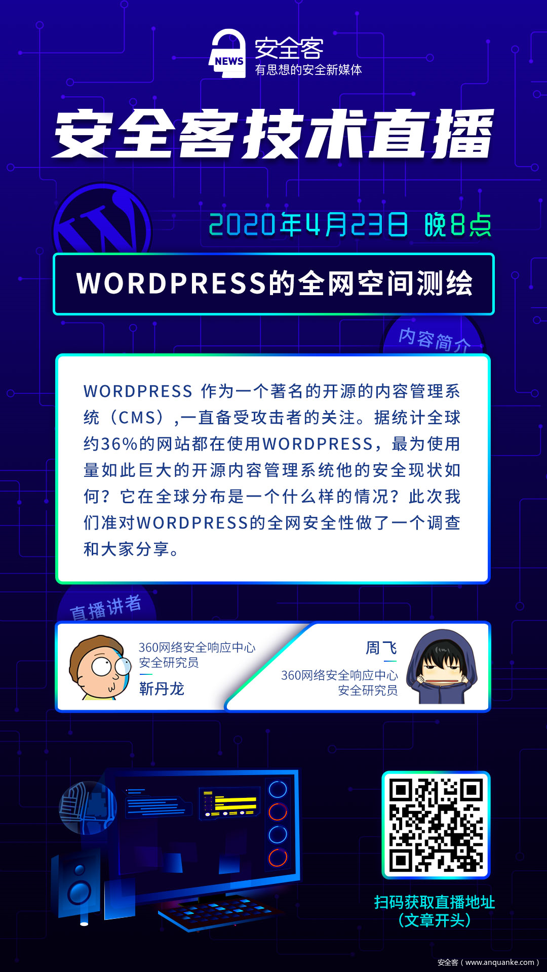 2020年4月23日晚20:00,我们邀请到了安全客资深作者靳丹龙、周飞为大家带来主题“WordPress 的全网空间测绘”。WordPress 作为一个著名的开源的内容管理系统(CMS),一直备受攻击者的关注。据统计全球约36%的网站都在使用WordPress,最为使用量如此巨大的开源内容管理系统他的安全现状如何?它在全球分布是一个什么样的情况?此次我们准对WordPress的全网安全性做了一个调查和大家分享。干货满满,不容错过!