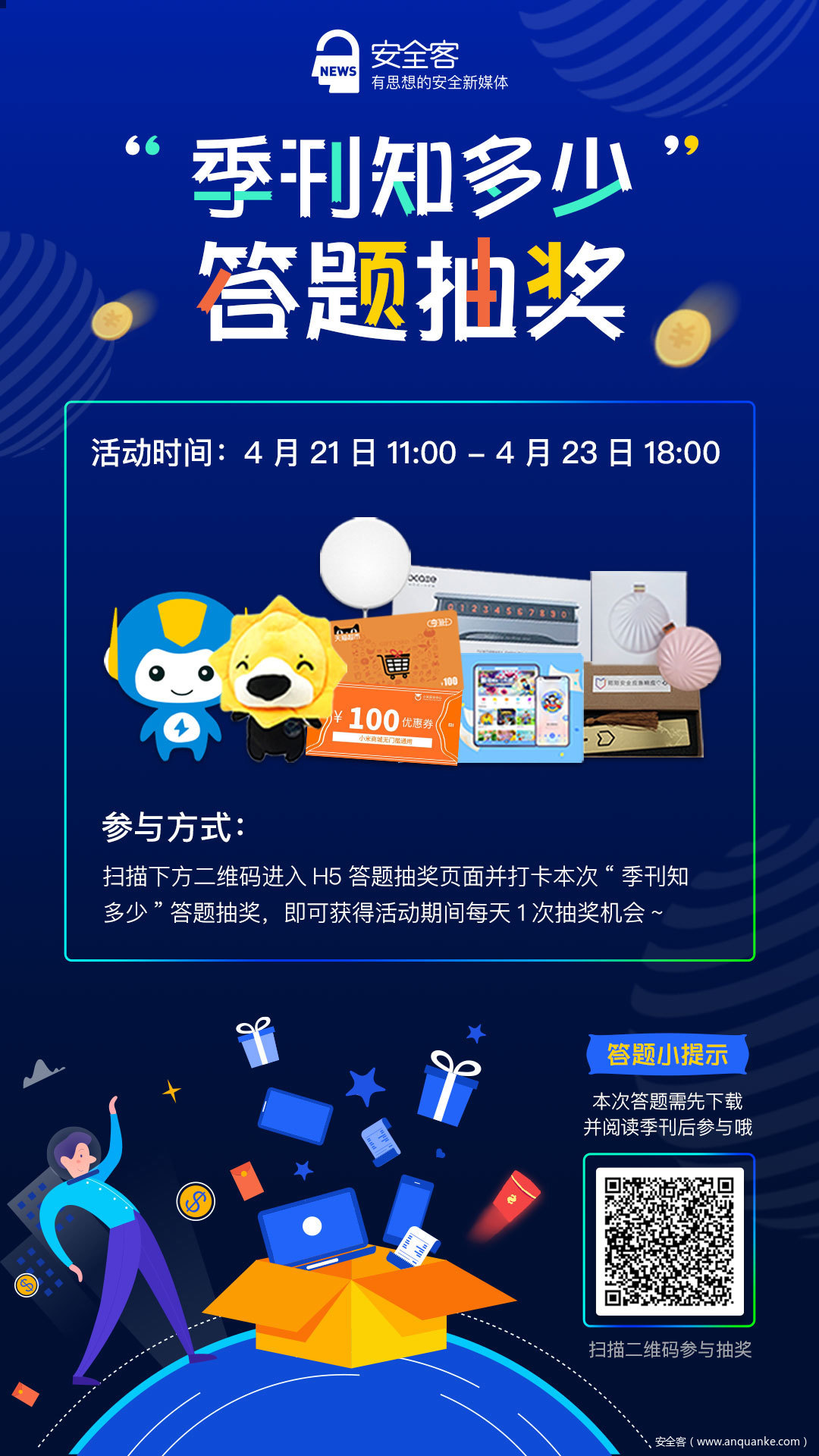 4月21日,安全客2020季刊—第1季再度上线,我们对文章的质量严格把关,对品质始终恪守不渝,只愿为安全爱好者带来最好的干货!从4月21日的11点到4月23日的18点,我们还放送出了数量丰富实用精致的定制好礼,赶紧参与季刊活动赢取奖品吧~
