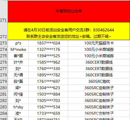 2.未填写地址的用户请在4月30日前进入安全客用户交流3群:830462644,联系群主@安全客发送您的地址+邮箱。过期不候哦~